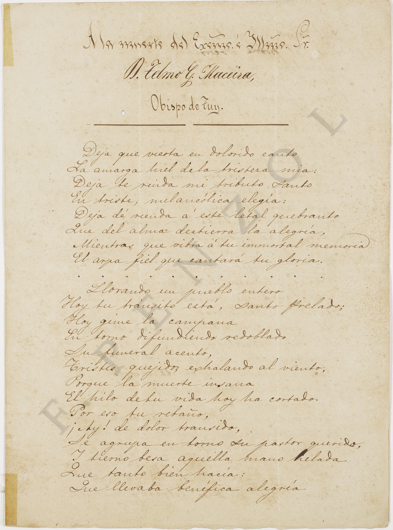 < dc:title > A la muerte del Excelentísimo e Ilustrísimo Señor Don Telmo G. Maceira, Obispo de Tuy : [Poesía] </ dc:title >