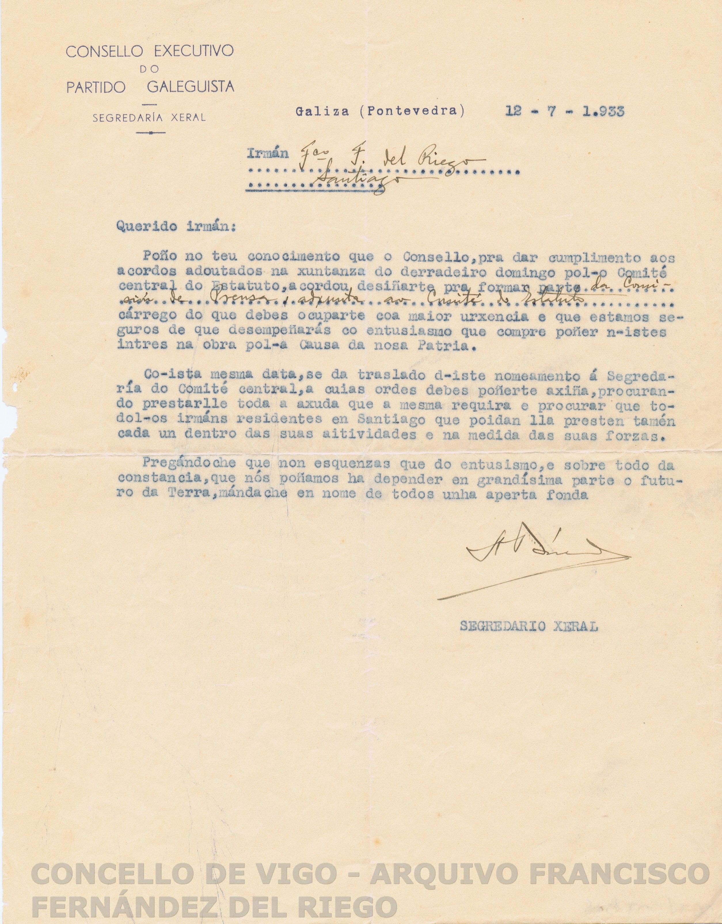 < dc:title > Carta de Alexandre Bóveda, Secretario Xeral do Consello Executivo, anunciando a Francisco Fernández del Riego o acordo do Consello Executivo do Partido polo que se lle nomea membro da Comisión de Prensa, órgano do Comité do Estatuto </ dc:title >