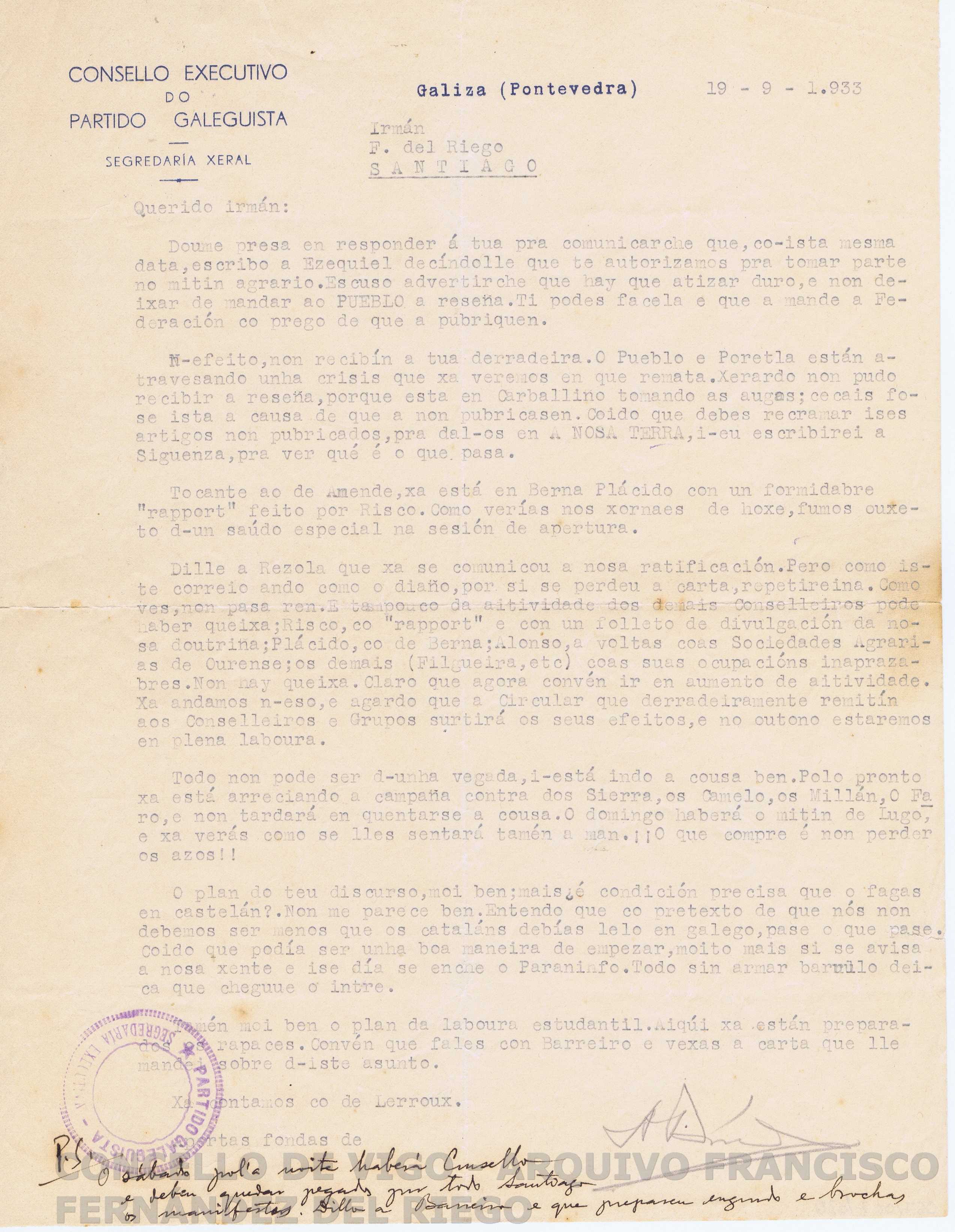 < dc:title > Carta de Alexandre Bóveda a Francisco Fernández del Riego sobre as actividades do Partido; Cuestións de propaganda e envío de artigos en El Pueblo Gallego, a estadía de Plácido Castro en Berna, a organización de Galeuzka, laboura estudiantil,... Insta a Fernández del Riego a pronunciar un discurso en galego </ dc:title >