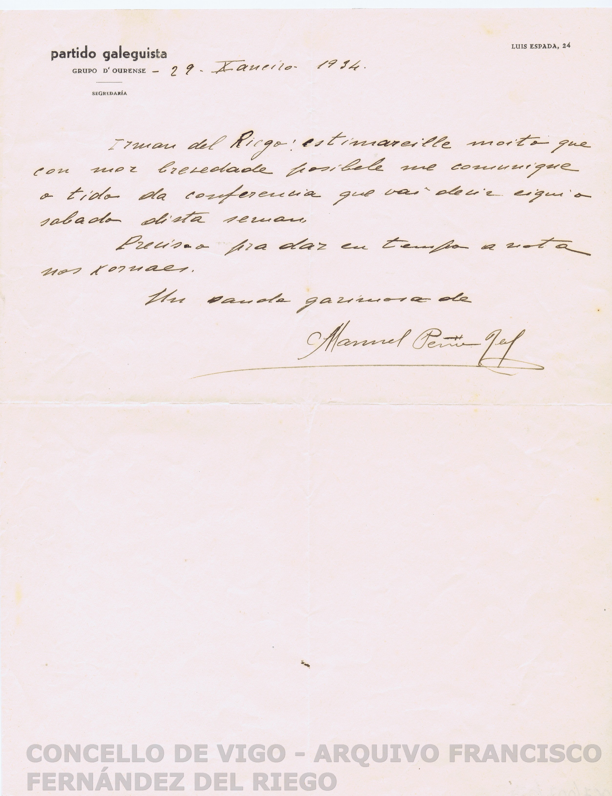 < dc:title > Carta de Manuel Peña Rey a Francisco Fernández del Riego para que lle proporcione o título da conferencia que vai pronunciar en Ourense </ dc:title >