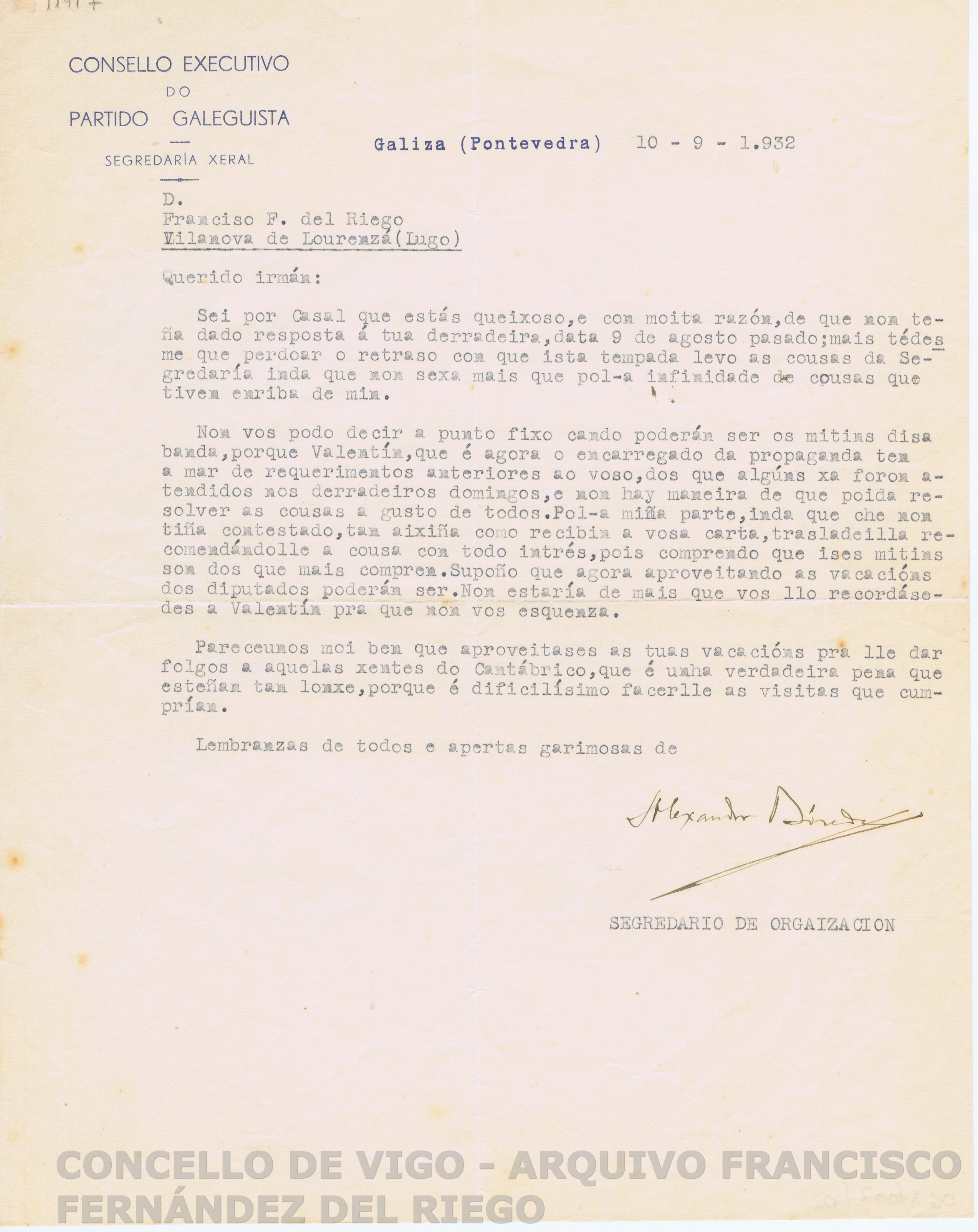 < dc:title > Carta de Alexandre Bóveda, Secretario de Organización do Partido Galeguista, a Francisco Fernández del Riego respostando unha anterior sobre a realización dunha serie de mitins </ dc:title >