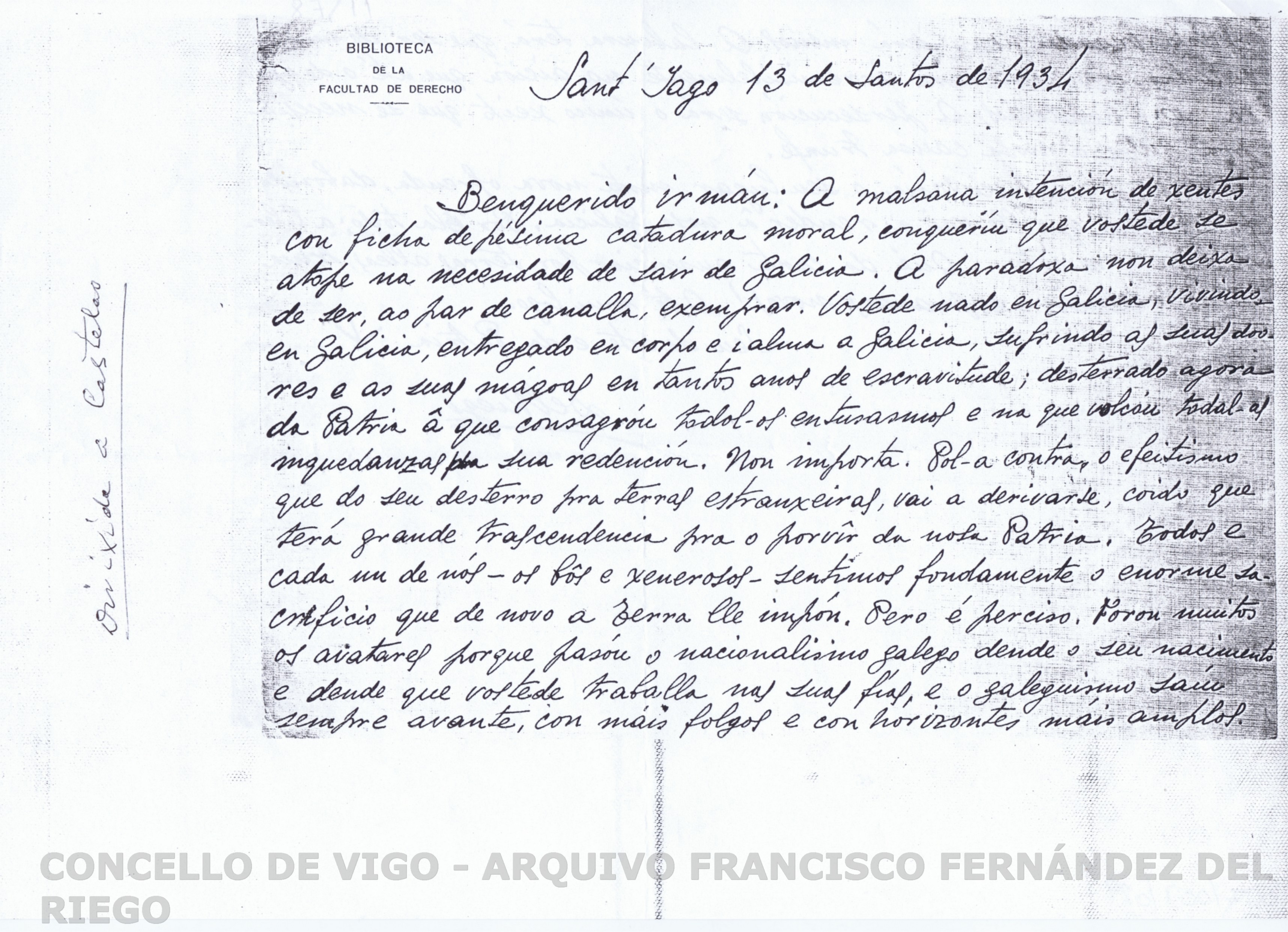 < marc21:subfield code =" a " > Carta de Francisco Fernández del Riego a Castelao con motivo do desterro deste último. Fotocopia </ marc21:subfield >