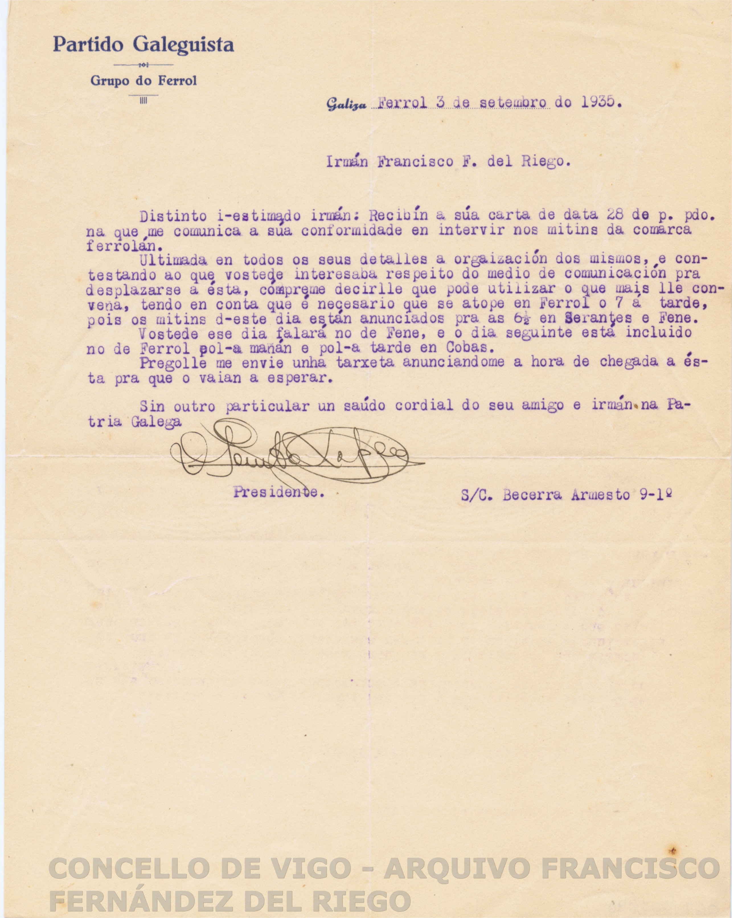 < dc:title > Carta de Domingo Pombo López a Francisco Fernández del Riego contestando a outra anterior sobre os detalles dos mítins organizados en Ferrol nos que intervén o último </ dc:title >