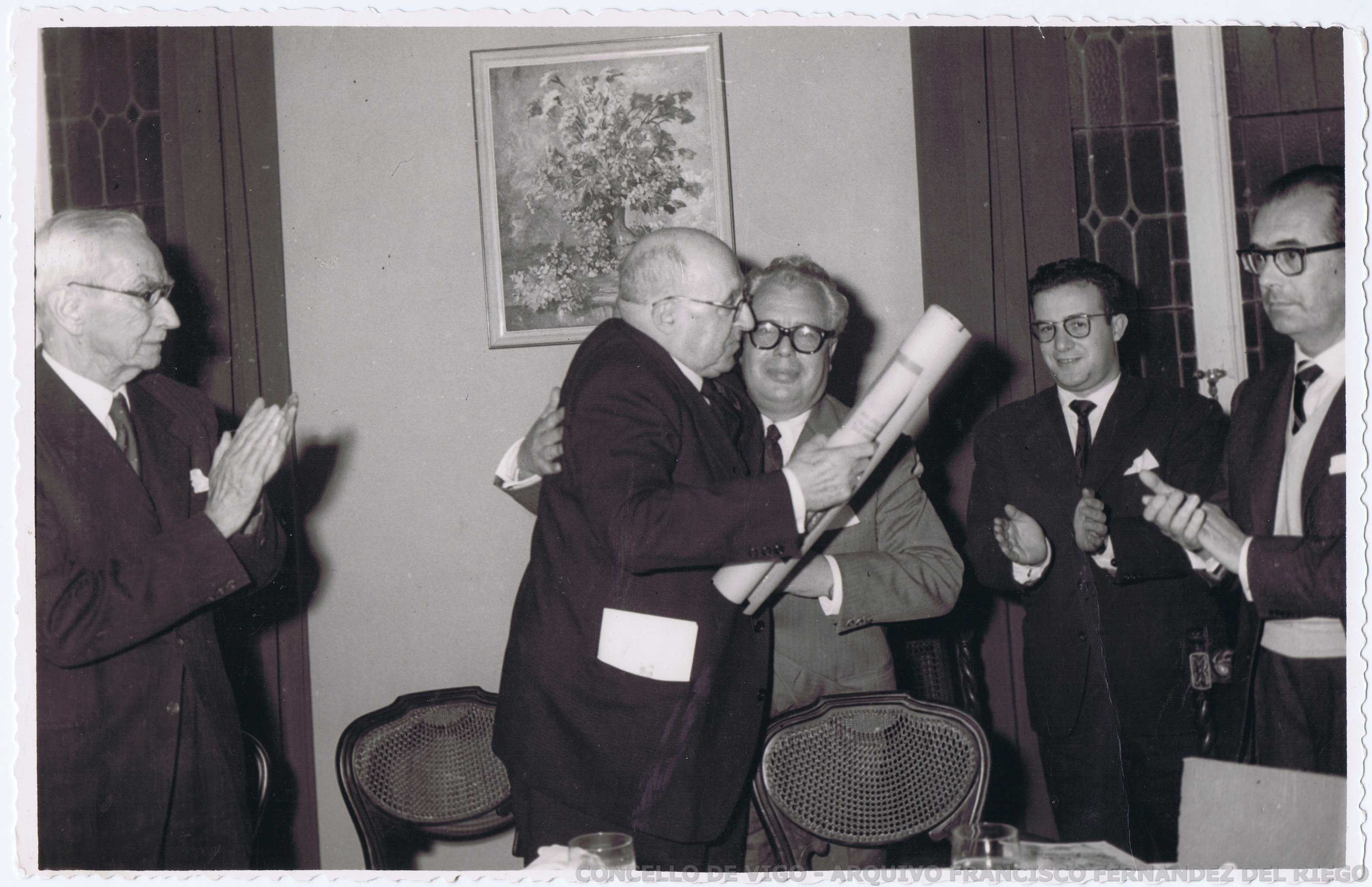 < dc:title > Banquete homenaxe a Ramón Otero Pedrayo no Hotel Compostela, no seu nomeamento como socio de honra do Centro Gallego de Buenos Aires. Francisco Fernández del Riego, delegado do Centro en Galicia, entrega un pergameo. De esquerda a dereita: Manuel Gómez Román, Otero Pedrayo, Fernández del Riego, López Nogueira e Domingo García-Sabell. </ dc:title >
